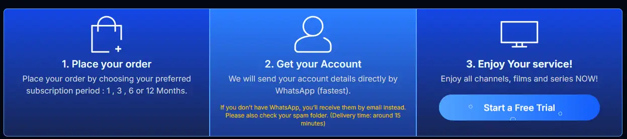 Across all durations, you get what most users care about: instant activation, a broad channel catalog, a sizable movie and series library, catch-up and EPG, multi-resolution output, consistently fast servers, and access to friendly support that genuinely responds. When you want proof, take the free trial first and stress-test your favorite genres at your typical viewing times.